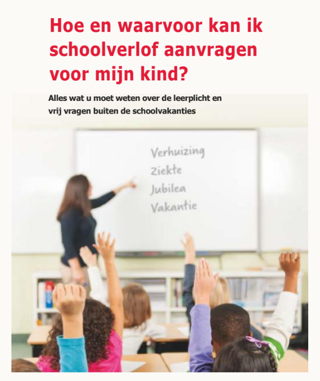 Aanvraag extra verlofBij bijzondere (familie)omstandigheden kunt u bij de directeur vrij vragen voor uw kind(eren). We verzoeken u dat, indien mogelijk, tenminste twee weken van tevoren aan te vragen. U vult dan het formulier “Aanvraag extra schoolverlof” in. Dit formulier kunt u bij de directeur of administratie verkrijgen. De leerplichtwet staat het de directeur niet toe vakantieverlof te verlenen onder schooltijd, zelfs geen dagdeel. De wet kent enkele uitzonderingsgevallen. Deze vindt u in het overzicht via de link onderaan de pagina. Neem voor meer informatie hierover minimaal 6 weken van te voren contact op met de directeur. In de volgende gevallen wordt in ieder geval geen extra verlof gegeven: Als een gezin toch zonder toestemming op vakantie gaat, is de directeur verplicht dit te melden aan de leerplichtambtenaar. Deze kan overgaan tot het opmaken van een proces-verbaal. Hieronder vindt u het stroomschema voor de beoordeling van vakantieverlof. Via dit schema kunt u alvorens een aanvraag te doen, zelf beoordelen of u recht heeft op vakantie verlof buiten de reguliere schoolvakanties. Een aanvraagformulier voor verlof kunt u bij de directie of administratie opvragen.