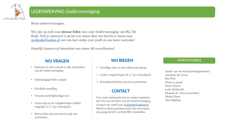 Wij zijn op zoek naar nieuwe leden voor onze Oudervereniging van IKC De Rank. Heb je interesse? Laat het ons weten door een bericht te sturen naar or.derank@sarkon.nl met een kort stukje over jezelf en een korte motivatie!
